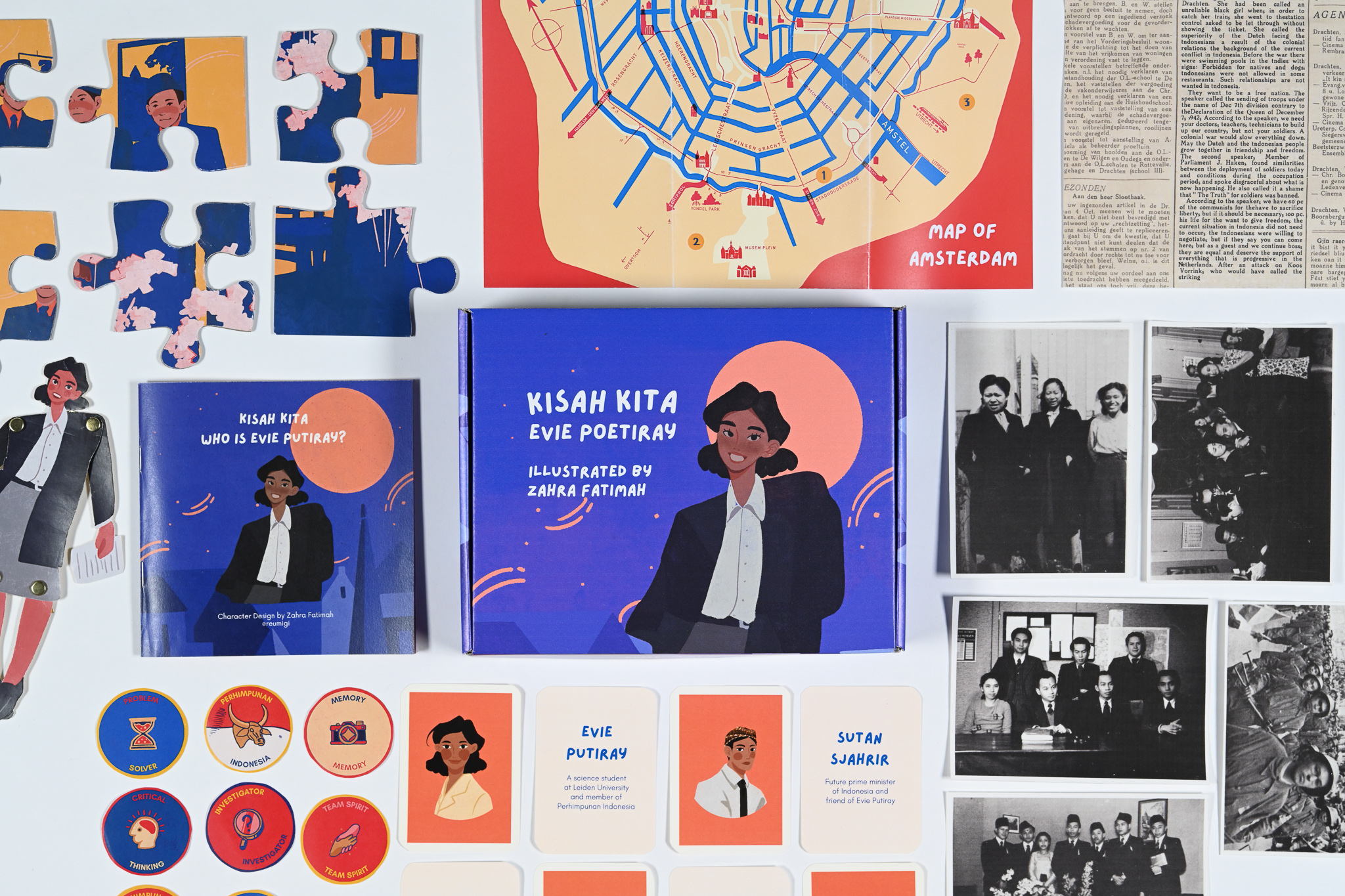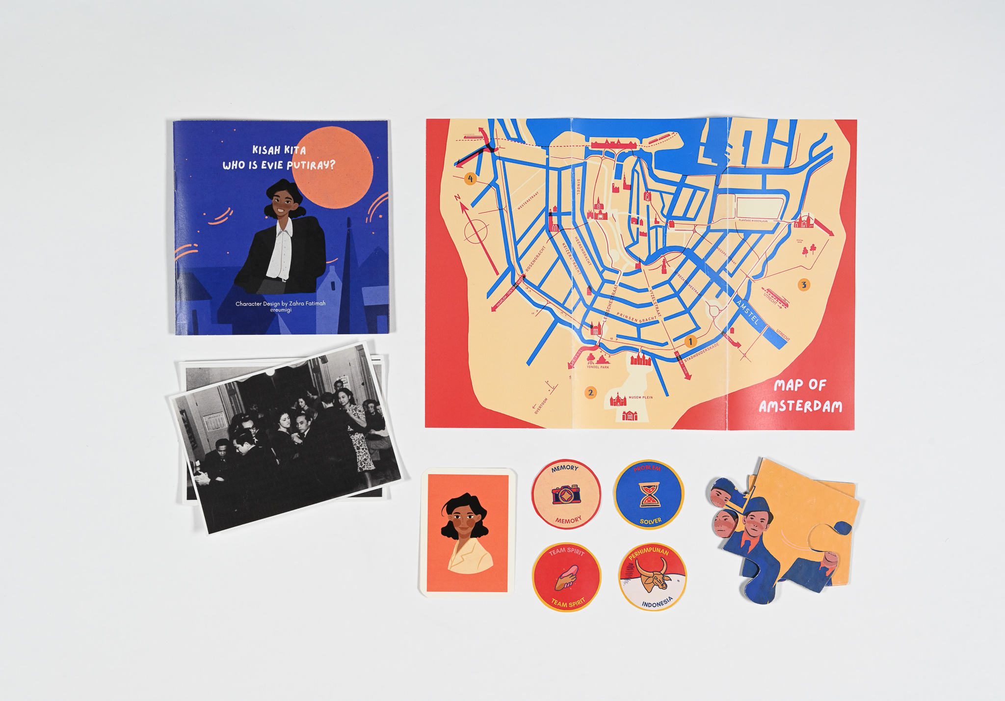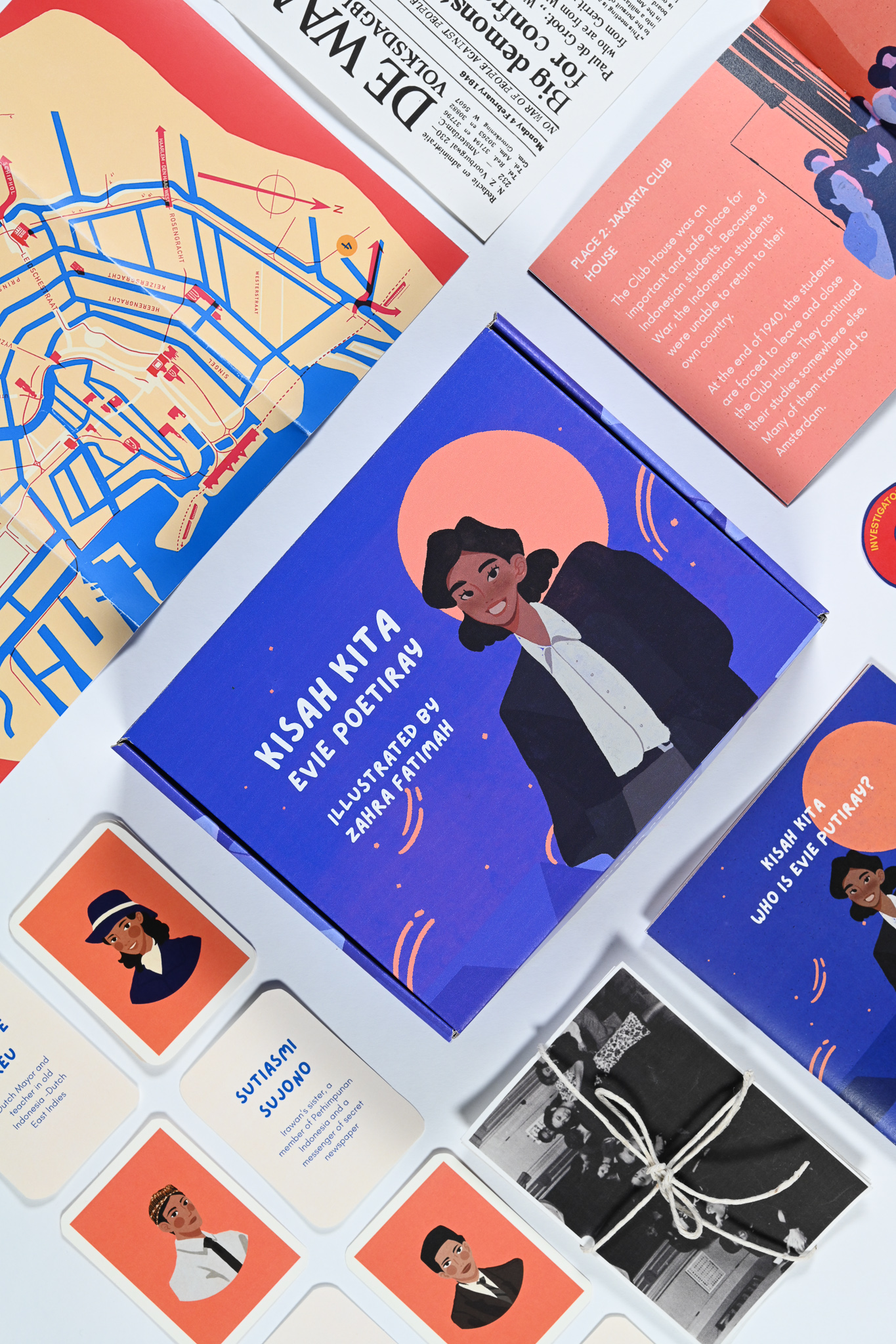It is a place to experience an engaging journey into the lives of historical Indonesian women during the revolution era. Get to know Evie Putiray's life. Each element within the kit contains stories and information to piece together her life -from photographs, newspapers to illustrations.