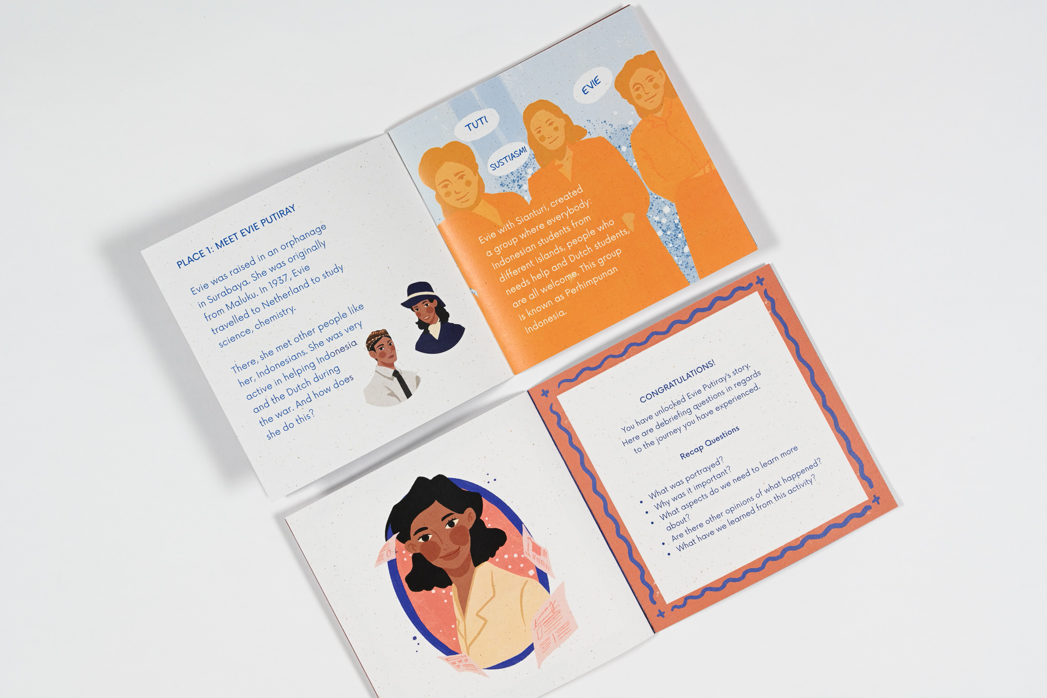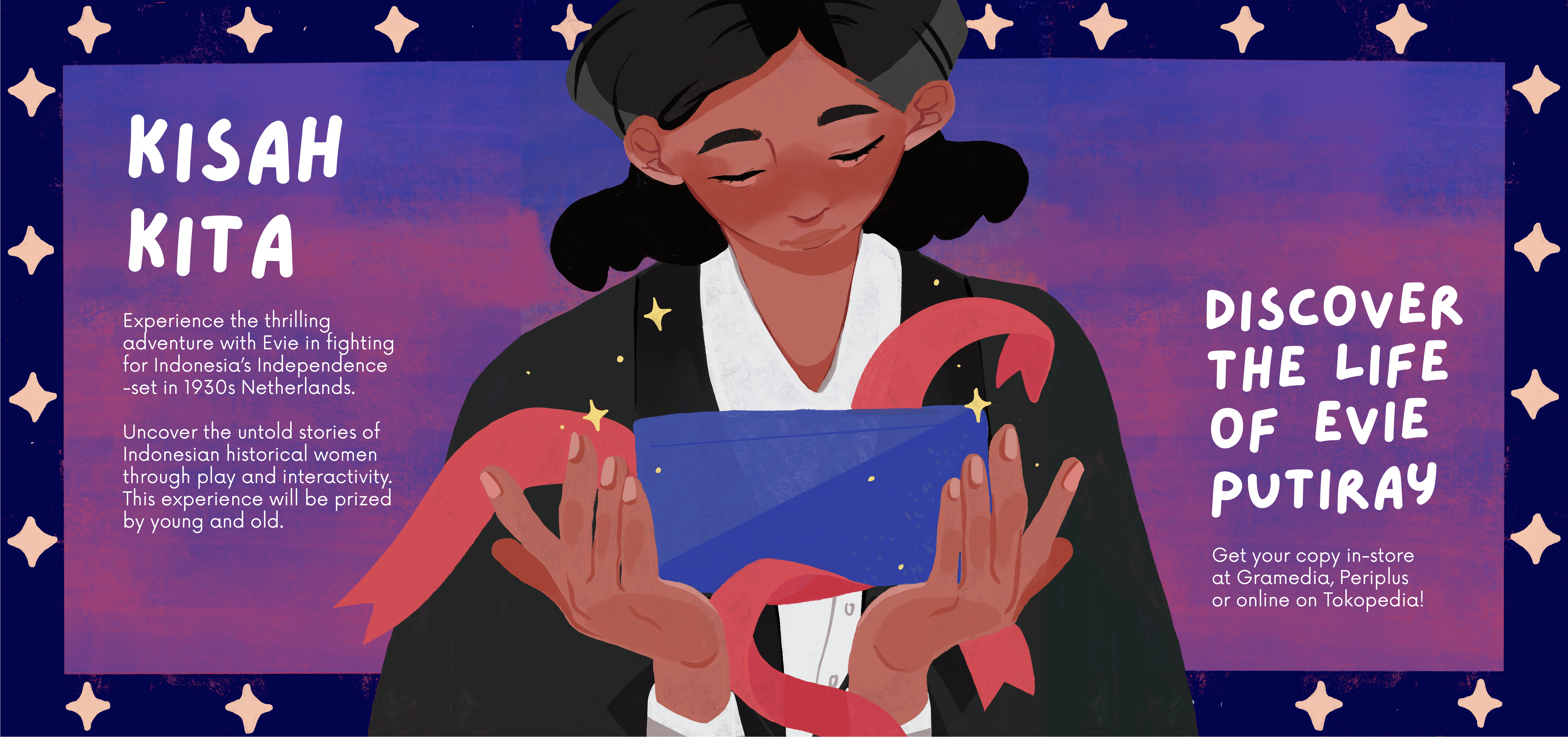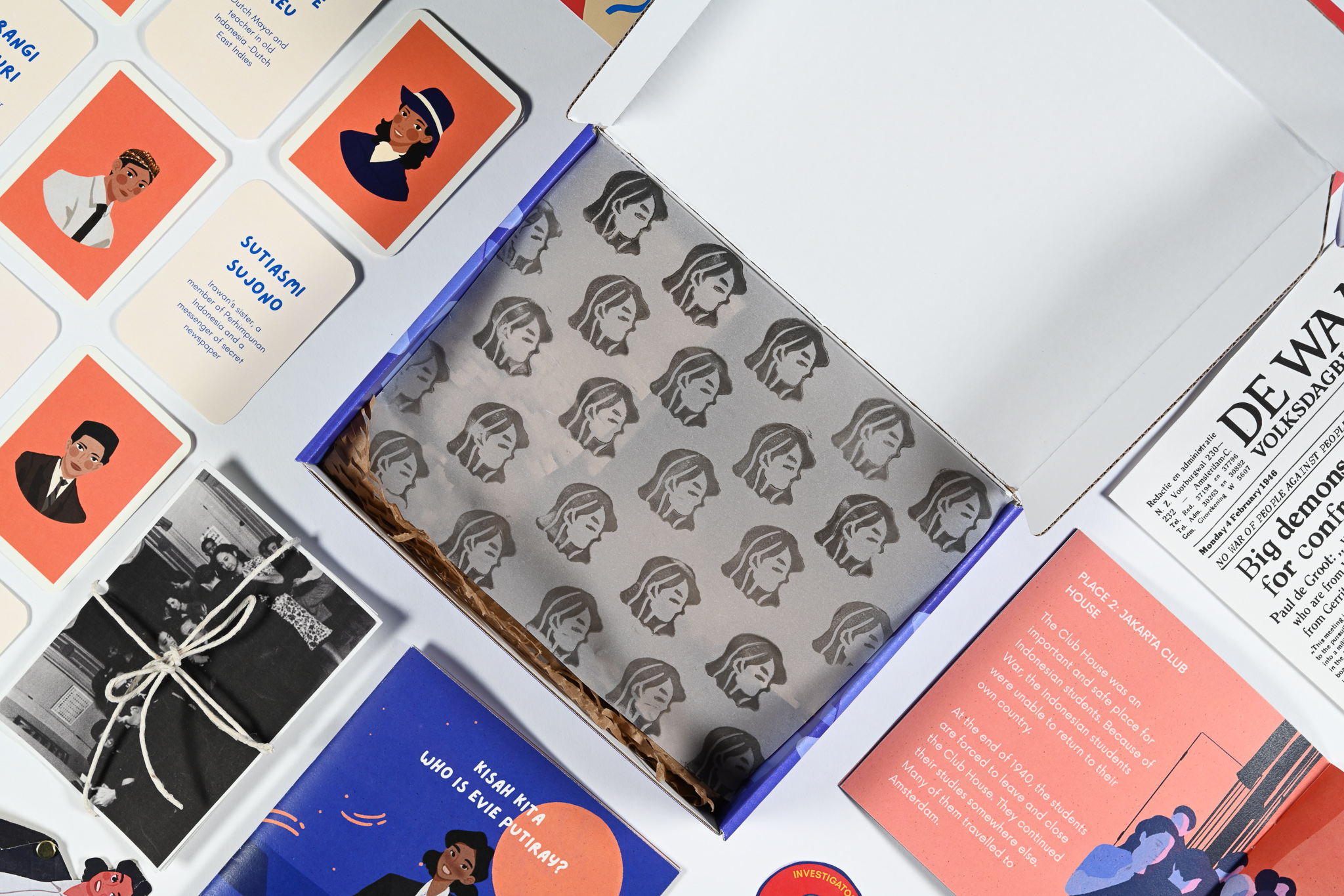 It is a place to experience an engaging journey into the lives of historical Indonesian women during the revolution era. Get to know Evie Putiray's life. Each element within the kit contains stories and information to piece together her life -from photographs, newspapers to illustrations.